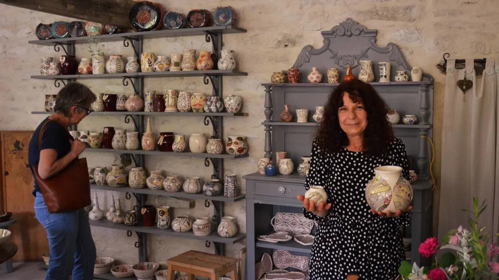C'est dans un vieux bâtiment rénové par son mari, que Marcelle installée. Venir chez Marcelle, c'est un peu rentrer dans un autre univers. En effet, comme elle le déclare elle-même, elle aime travailler la terre dans tous ses états, aussi bien dans la poterie que dans son jardin, car pour rejoindre son atelier, il faut cheminer au travers d'un jardin fleuri et décoré de diverses poteries. La petite maison nichée dans la verdure, se voit à peine et tout au bout on découvre l'atelier décoré par ses soins. « J'ai toujours voulu faire de la poterie. J'ai démarré à 19 ans en autodidacte, mais j'ai tout de même appris les bases dans un atelier, car il y a des techniques qu'il faut connaître. J'en ai fait toute ma vie, et maintenant que je ne travaille plus, j'avais envie de m'agrandir, d'où la création de cet atelier. Après le façonnage à la main j'ai eu envie de démarrer également le travail sur un tour il y a six ans environ, mais il m'a fallu trois ans avant de faire quelque chose de concret, car ce n'est pas aussi simple qu'il y paraît. » Et dans son atelier on peut trouver plus de 200 pièces, des très petites (comme des boutons ou encore des boucles d'oreilles), et des plus grosses comme des vases de formes très originales. « Je m'inspire beaucoup de la nature pour mes motifs sur mes poteries, mais je crée également des objets sur lesquels j'apporte du relief (avec des napperons par exemple), j'ai également des pièces de vaisselle, des petits plats et des vide-poches, etc. J'essaie d'en faire pour tous les goûts, et mes pièces varient de 5 € à 70 €. Je peux réaliser des commandes pour peu que les gens m'expliquent bien ce qu'ils veulent et je vais mettre en place des ateliers pour ceux qui auront envie de faire leurs propres créations pour les fêtes par exemple. »